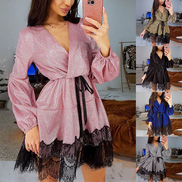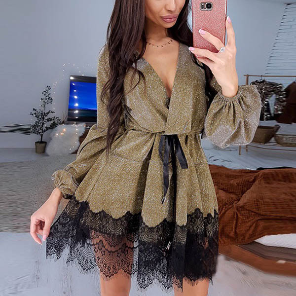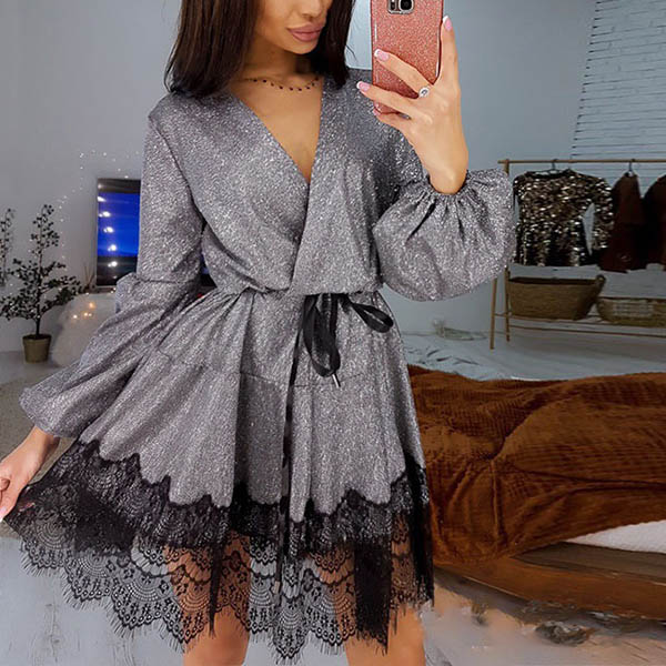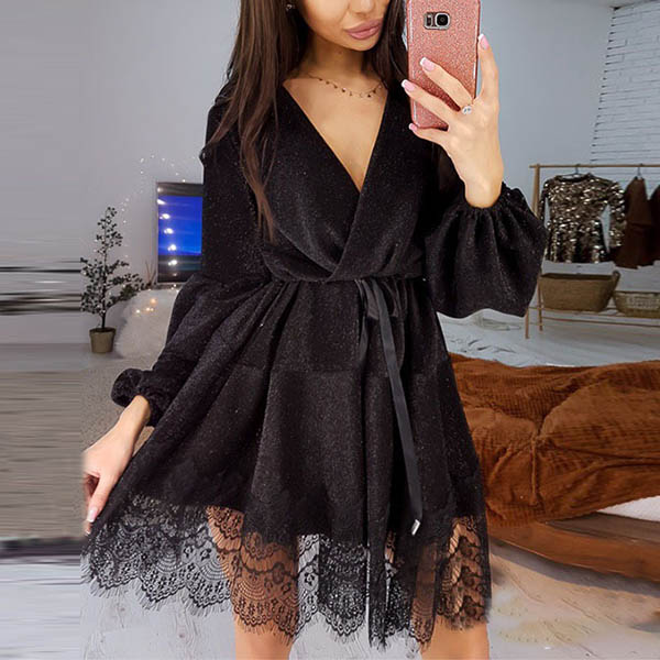Sexy V-neck Lace Spliced Hem Long Sleeve Dress