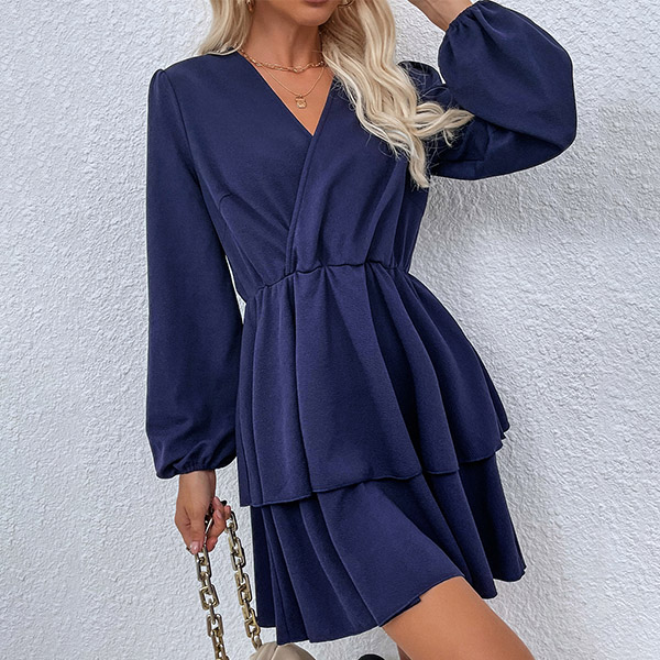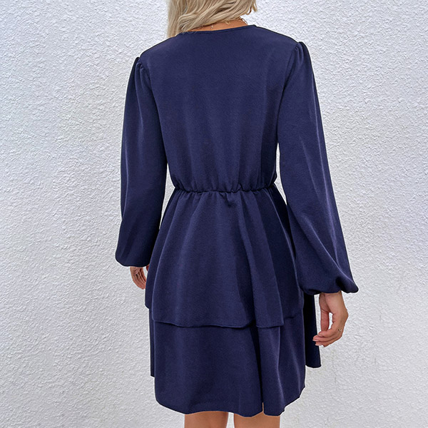 Sexy V-neck Lantern Sleeve High Waist Dual-layer Hem Solid Color Dress