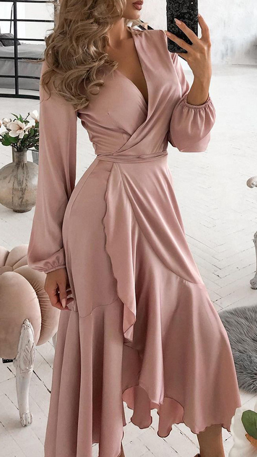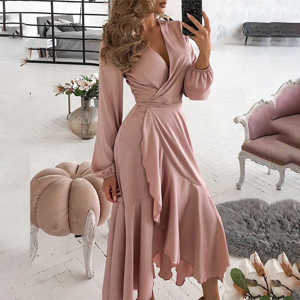 This dress is the one that will effortlessly enhance your level of stylish and femininity. That's why we love this dress! Com es with a sweet pink tone,finished with lantern sleeve,v-neck and an irregular ruffle hem,this dress knows how to exude your flirty,sexy and feminine sense. Save this wonderful piece for your fancy events!