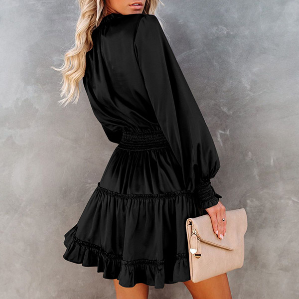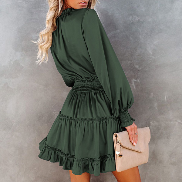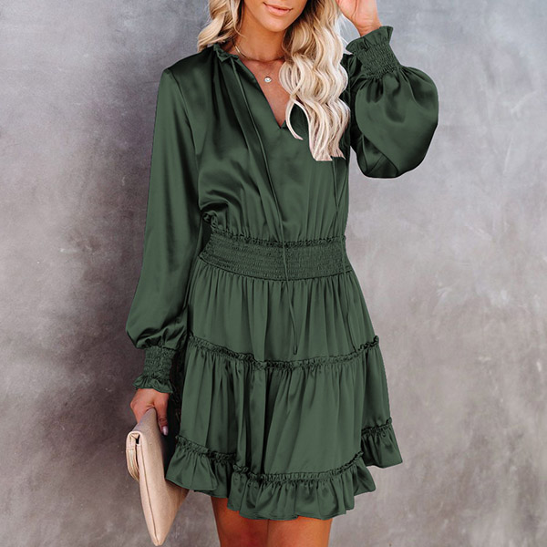 Sexy V-neck Lantern Sleeve Ruffle Hem Elastic Waist Solid Color Dress
