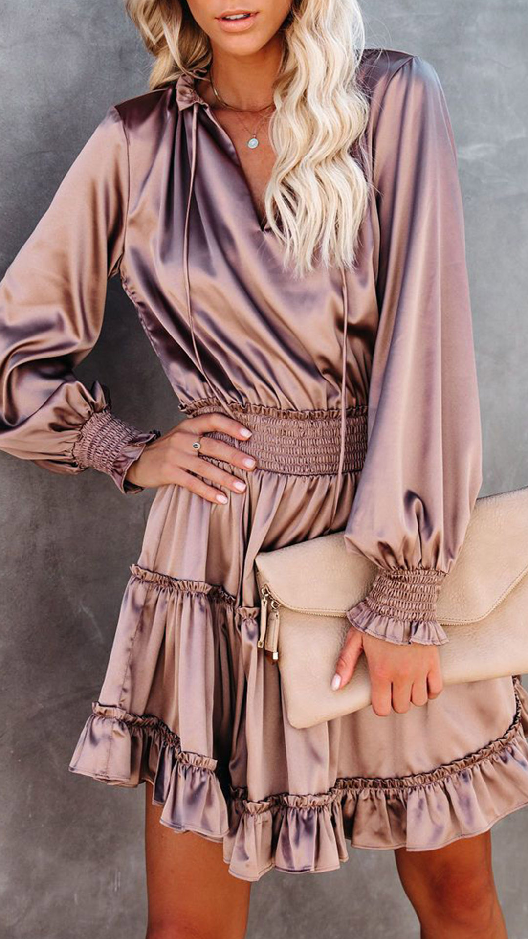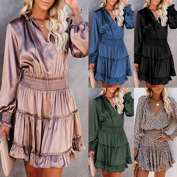 Combines of sweet and flirty vibes,this dress can help you catch more eyes. Solid color style,the v-neck,puff sleeve and ruffle hem design make this piece look so stylish and attractive. And the elastic waist design can showcase your figure and waistline. When invited to a night party or weekend gathering,this dress can easily strike your mind.