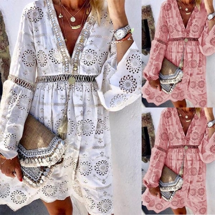 Cozy,sexy and effortlessly fashionable,this dress is yearning for a place in your wardrobe. The deep v-neck and hollow out lace details make it look so sexy and alluring. When you have a dating with your boyfriend,you can choose this dress to win his eyes.
