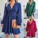 Sexy V-neck Long Sleeve High Waist Solid Color Chiffon Dress