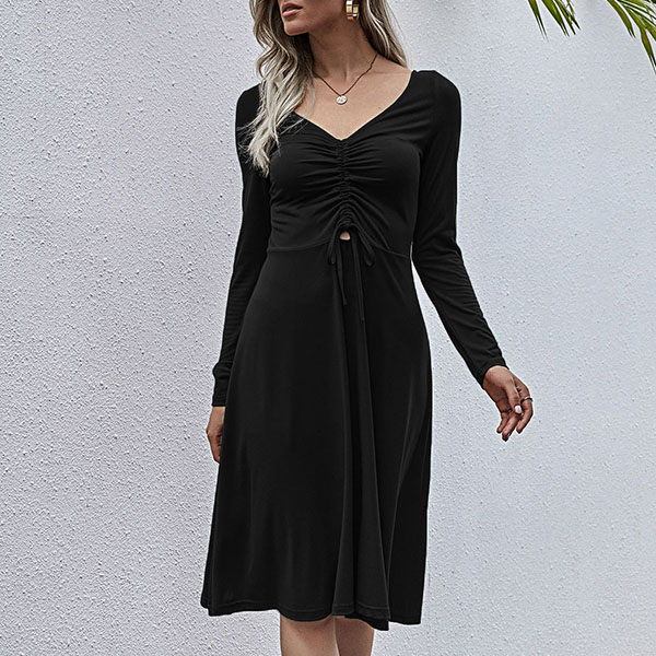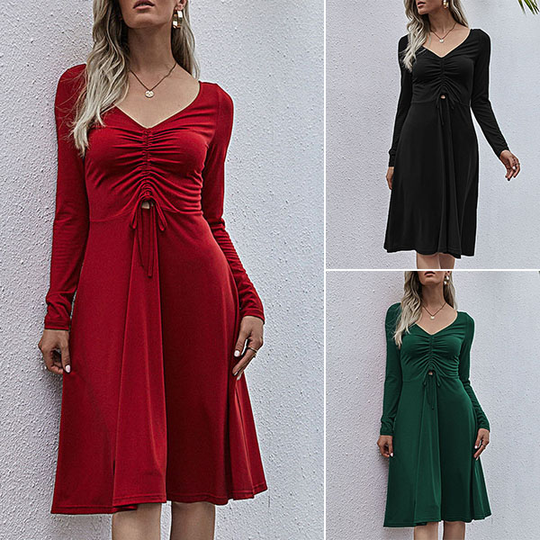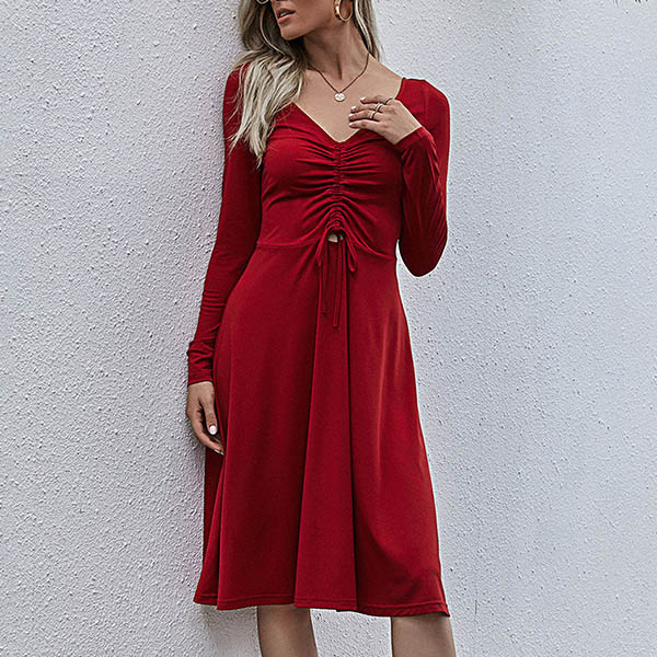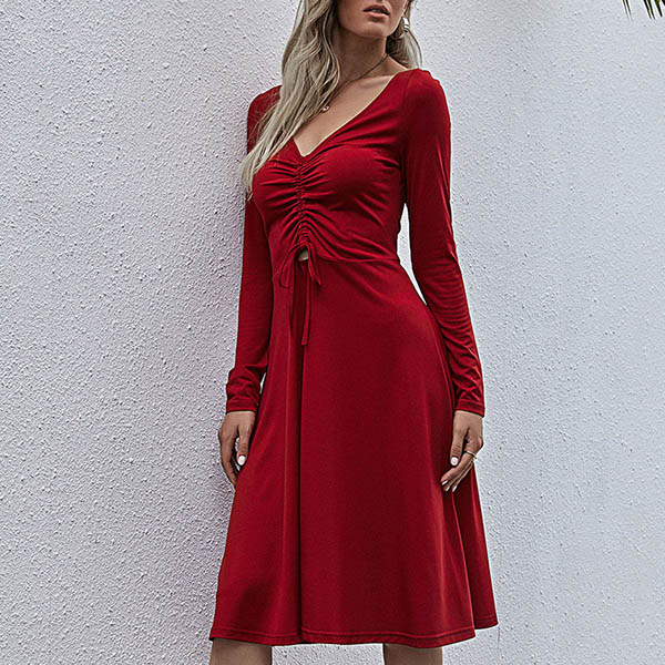 When invited to a dinner date,you can just slip into this dress to express your beauty and charm. Solid color tone design makes it look elegant yet generous,while the v-neck and drawstring design can add its entire charm. Just need to match with your sexy heels and sparkle necklace,then you can look beautiful enough!