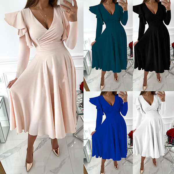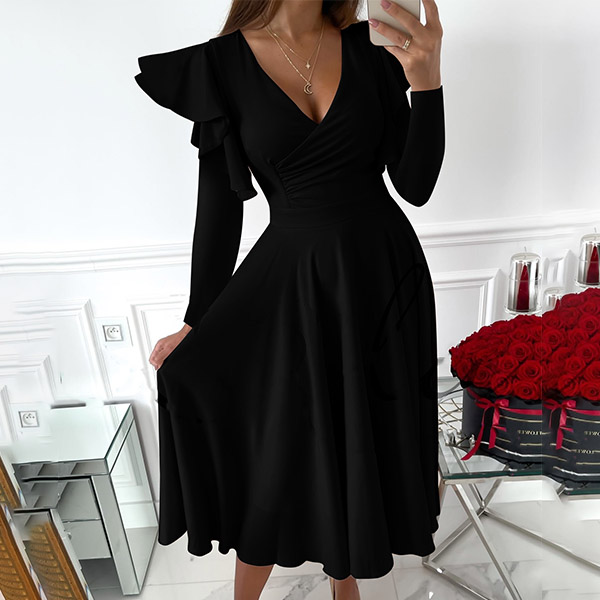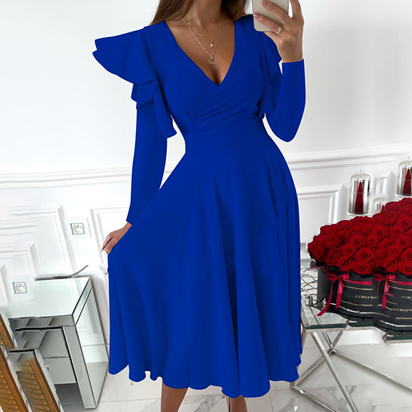 Sexy V-neck Long Sleeve High Waist Solid Color Ruffle Dress