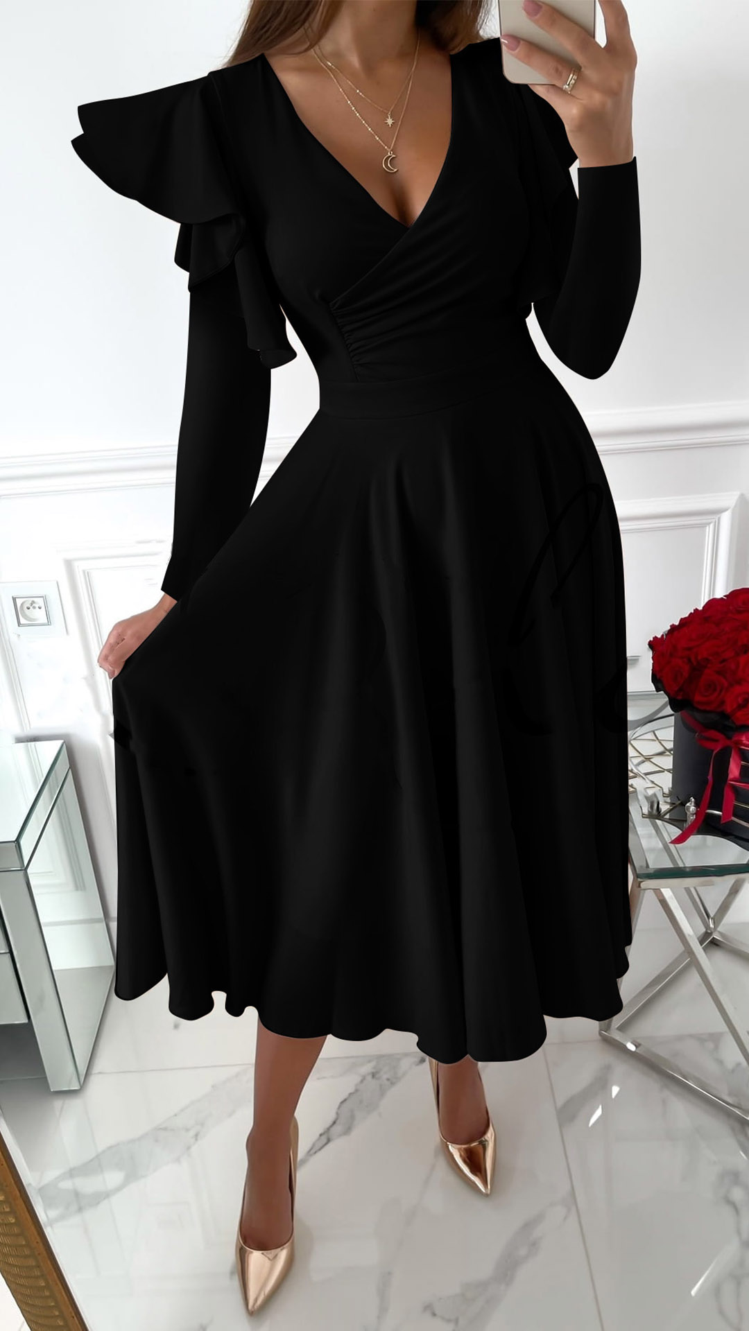 If you are looking for a proper dress for your daytime out or night dating,then you can just have a try this dress. Boasts a solid color,the v-neck and ruffle design can lend you some sweet,flirty yet feminine sense,while the high waist design would showcase your figure. You can just dress it up with your sexy heels for a beautiful look!