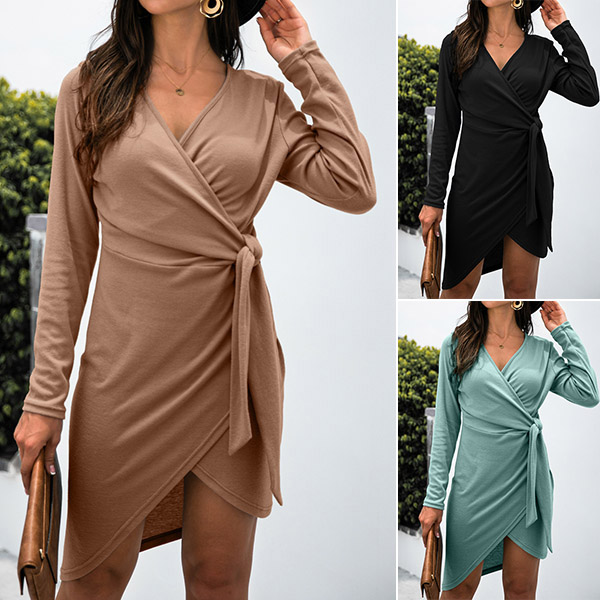 Sexy V-neck Long Sleeve Irregular Hem Lace-up Dress