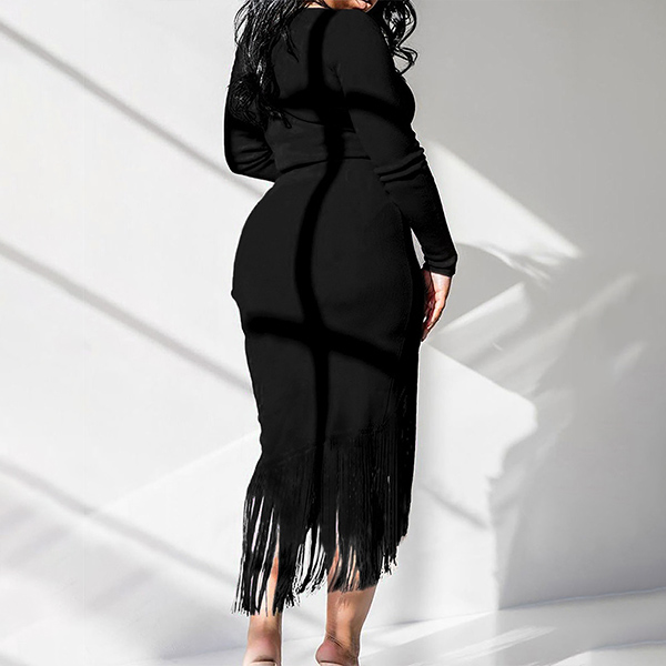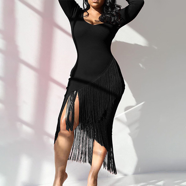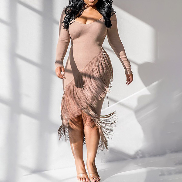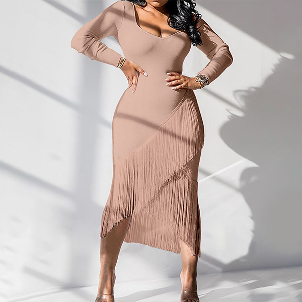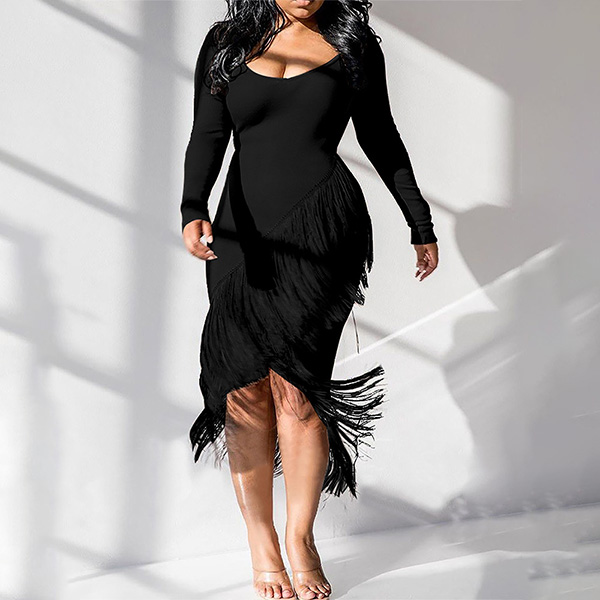 You are sure to arouse a splash when you dress yourself up with this dress. It comes with a solid color,the v-neck and irregular tassel hem design make this piece look so sexy and distinctive,while the fit silhouette design will highlight your figure. Save this little stunner for your fancy events.
