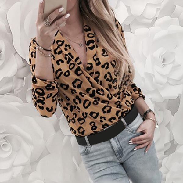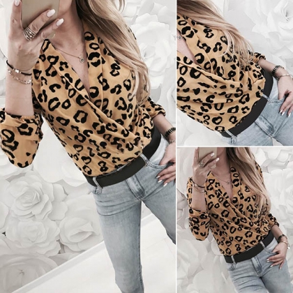 Sexy V-neck Long Sleeve Leopard Printed Top