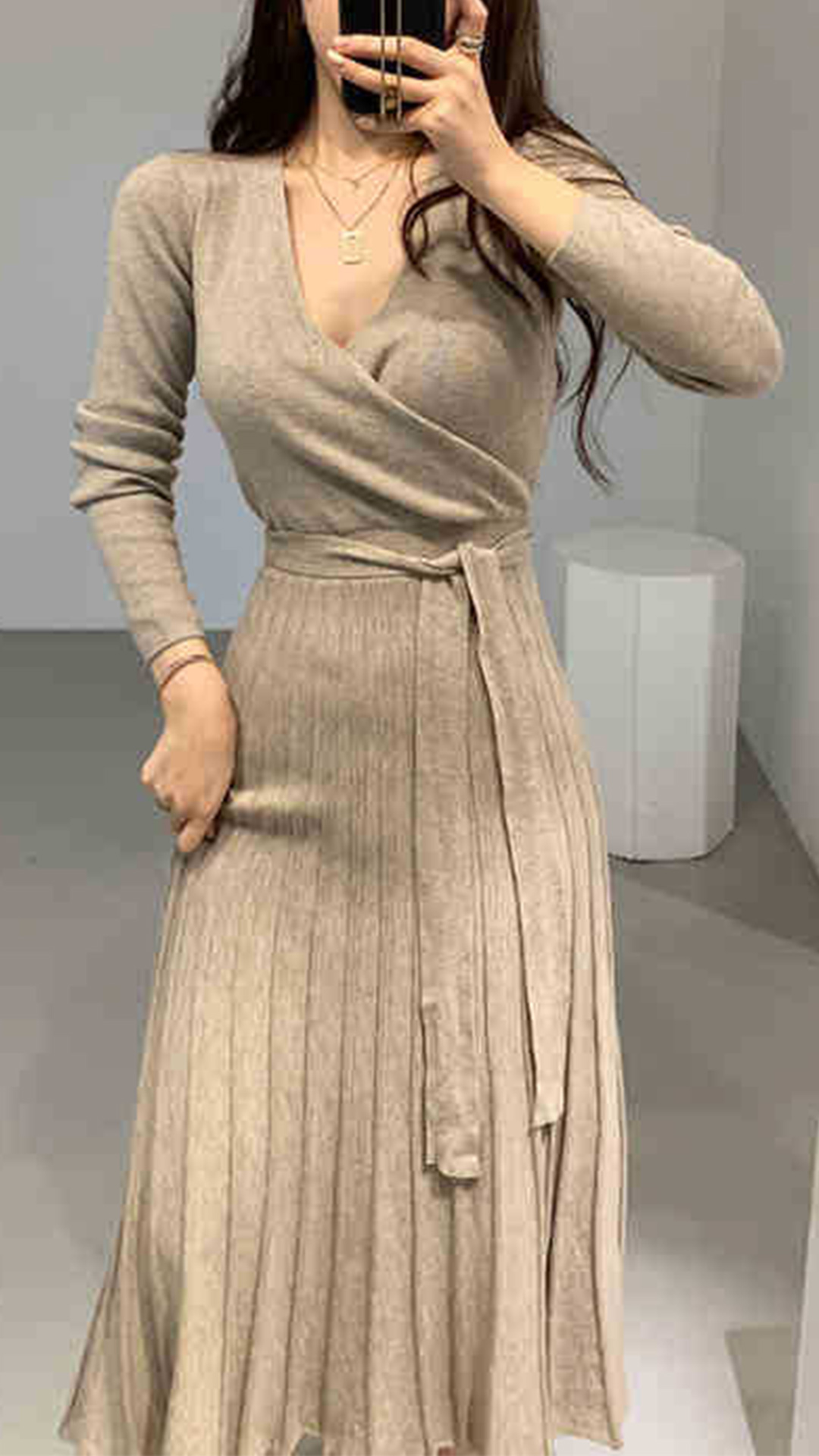 It is an easy thing to portray your elegant and charming image with this knit dress. The v-neck and pleated hem design make this piece look so flirty and stylish,while the high waist with tie-belt design can better showcase your slender figure. Your perfect partner in these spring and autumn days.