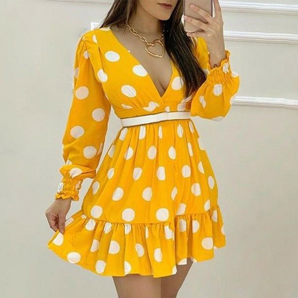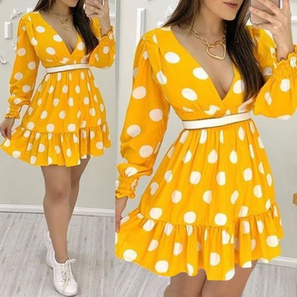 Start your wonderful day with a delightful dress such as this piece. The dots printed details make this piece look so eye-catching and playful,while the v-neck and ruffle hem design can easily enhance your feminine appeal. No matter for your night dating or weekend out,this dress can be your wise choice.