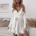 Sexy V-neck Long Sleeve Ruffle Hem Solid Color Tie-belt Dress