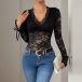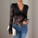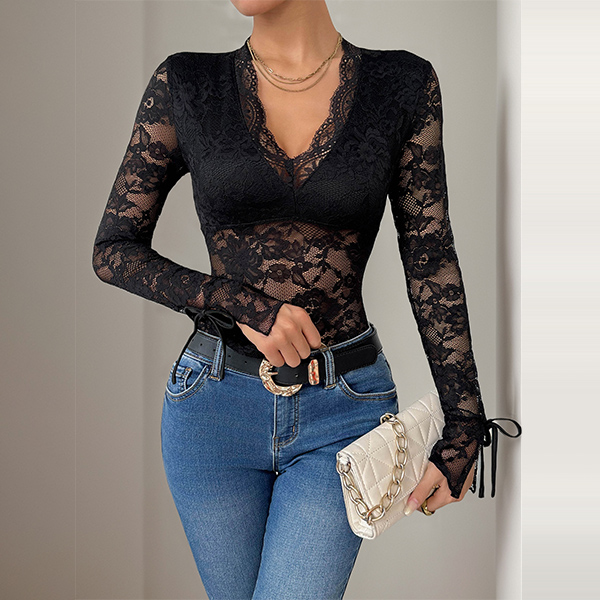 Sexy V-neck Long Sleeve Semi-through Lace Bodysuit