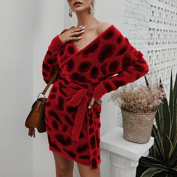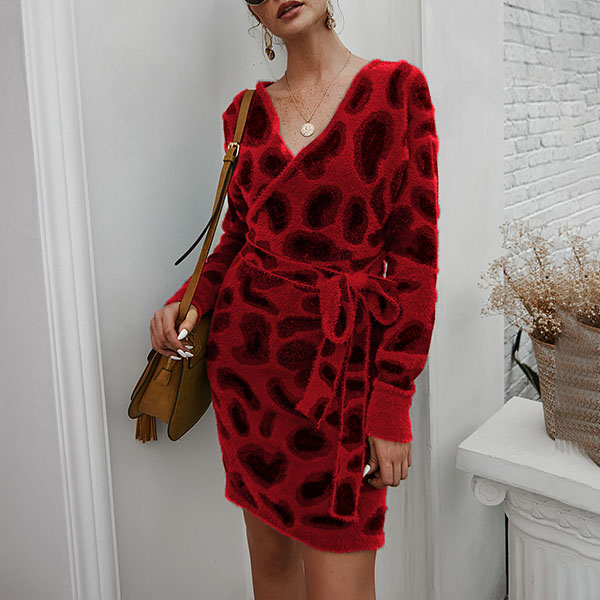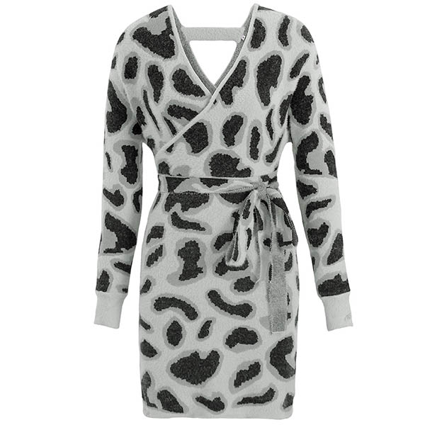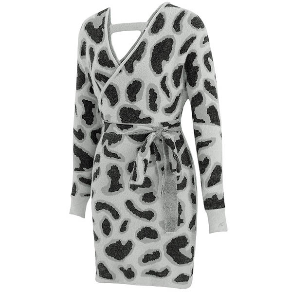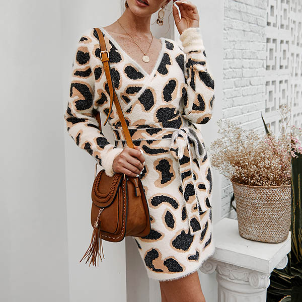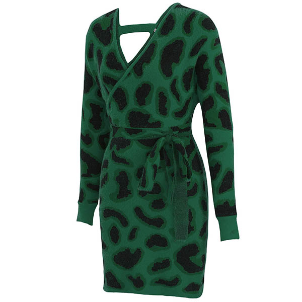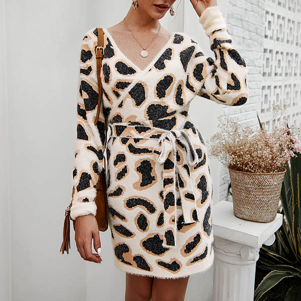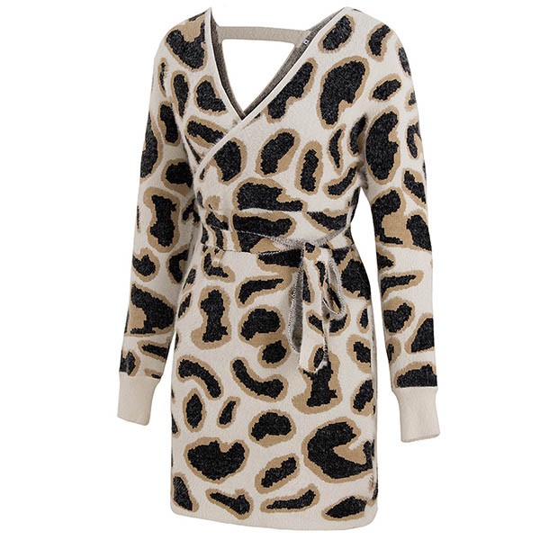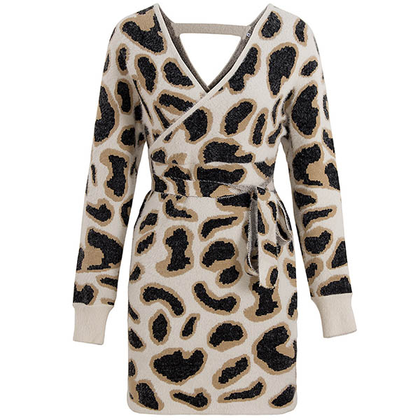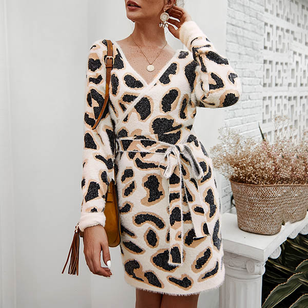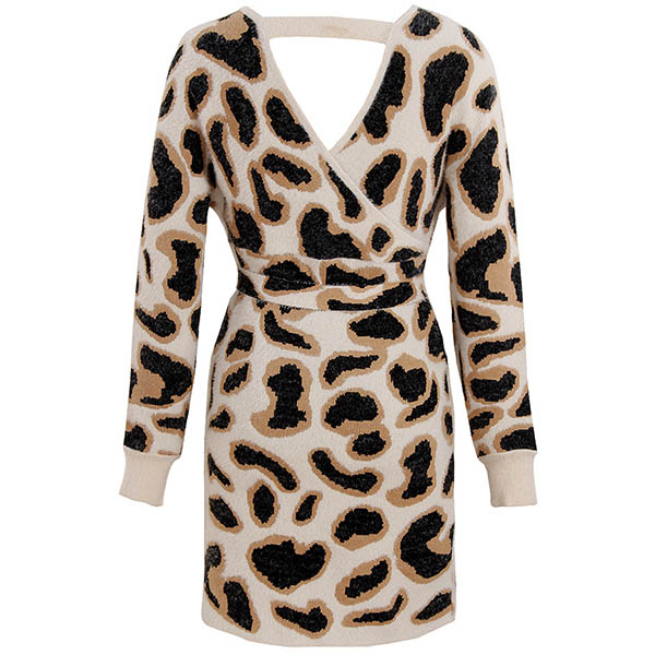 Sexy V-neck Long Sleeve Slim Fit Leopard Prinfed Knit Dress
