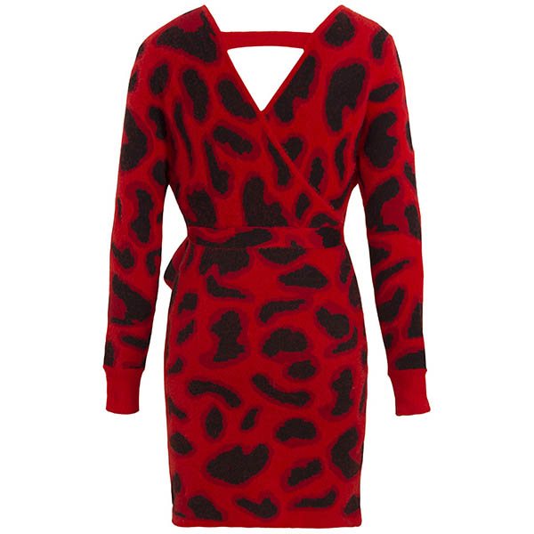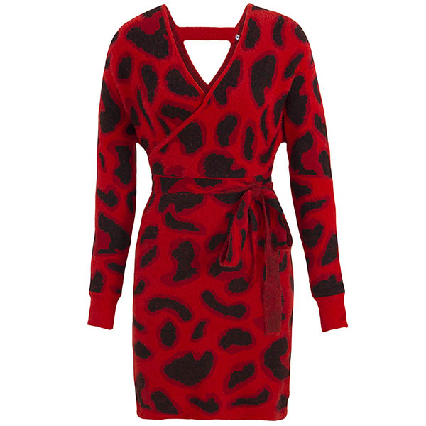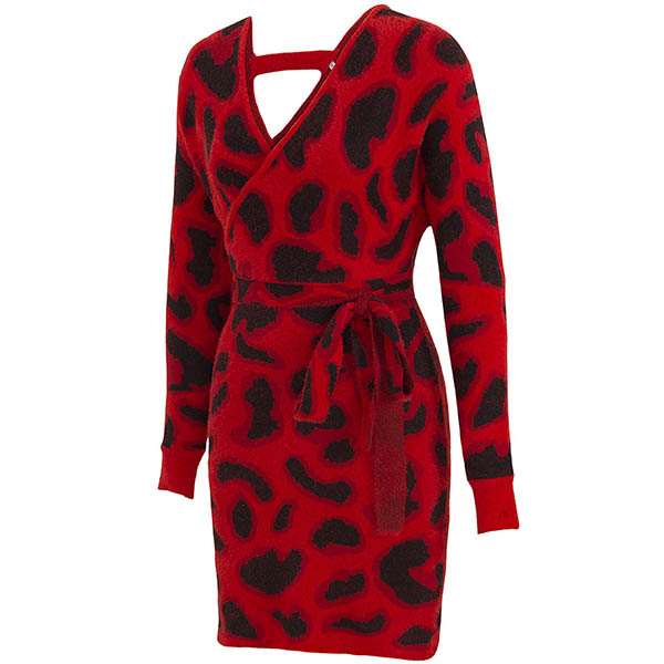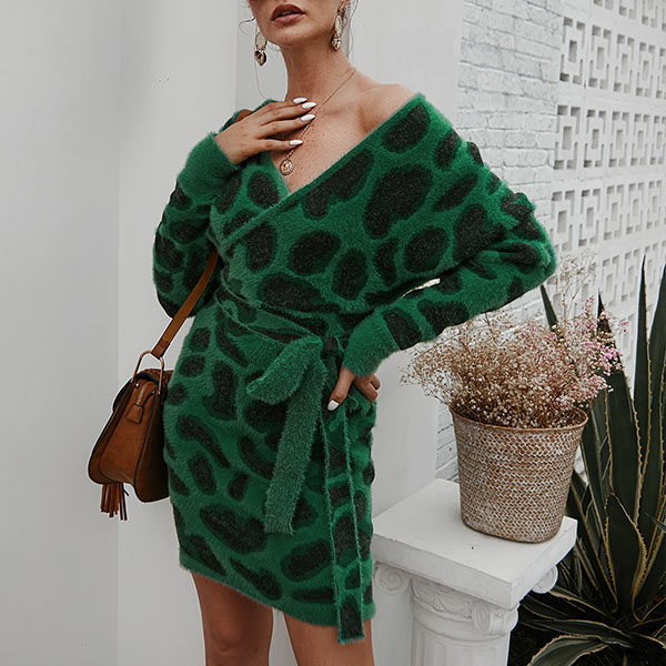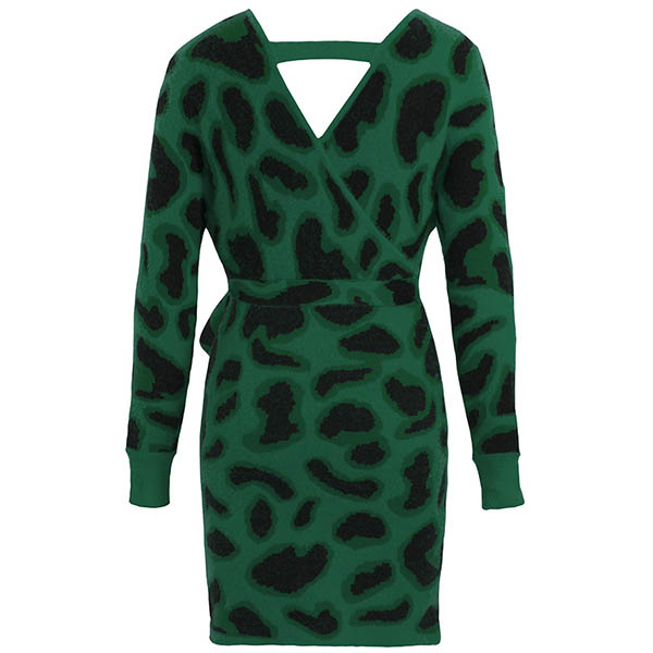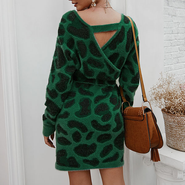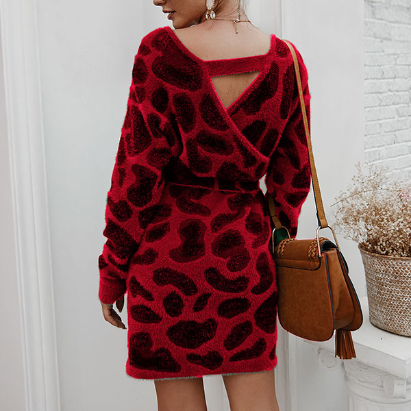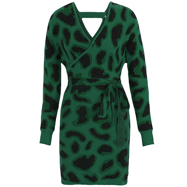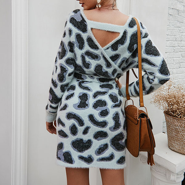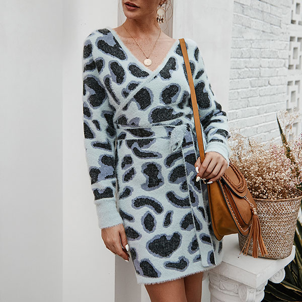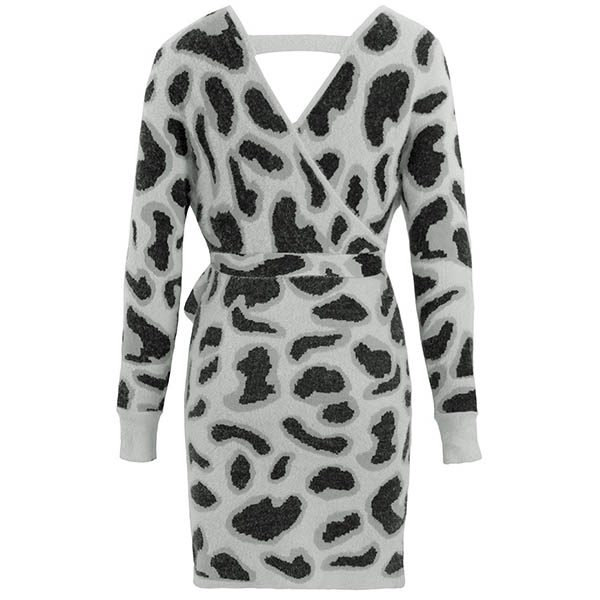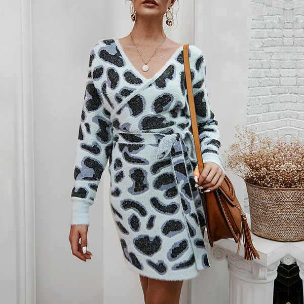 Sexy V-neck Long Sleeve Slim Fit Leopard Prinfed Knit Dress