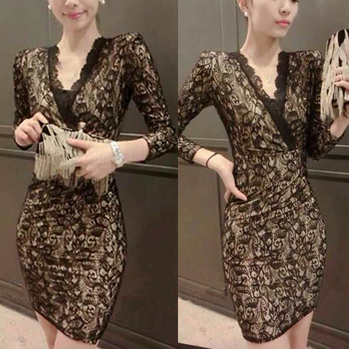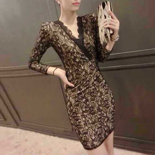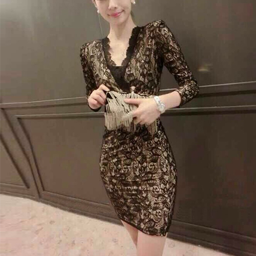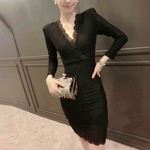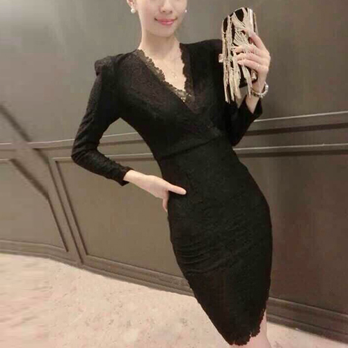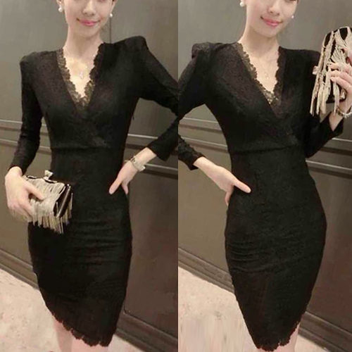 Sexy V-neck Long Sleeve Slim Fit Package Hip Lace Dress