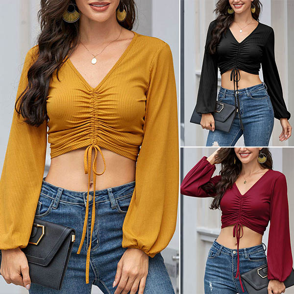 Sexy V-neck Long Sleeve Solid Color Drawstring Crop Top