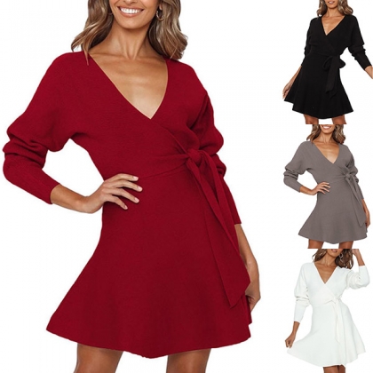 When the days get a little cold,this knit dress can be your wise choice. Solid color style,he v-neck design can help enhance your feminine appeal,while the waist strap design can showcase your slender figure. You can add a sparkle necklace if you wanna look more beautiful.