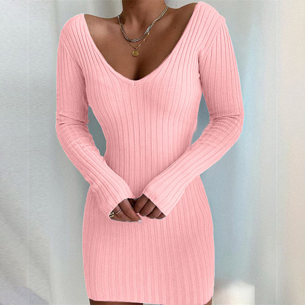 Sexy V-neck Long Sleeve Solid Color Slim Fit Dress