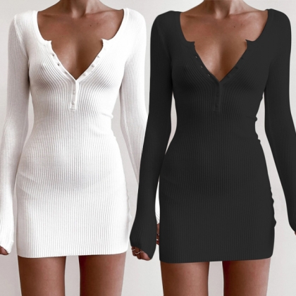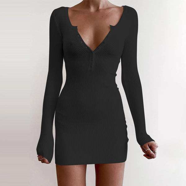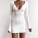 Sexy V-neck Long Sleeve Solid Color Slim Fit Dress