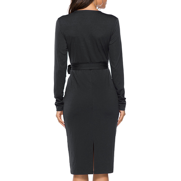 Sexy V-neck Long Sleeve Solid Color Slim Fit Dress