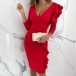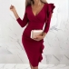 Sexy V-neck Long Sleeve Solid Color Slim Fit Ruffle Party Dress