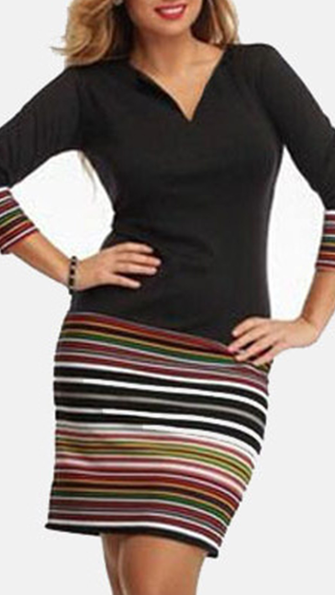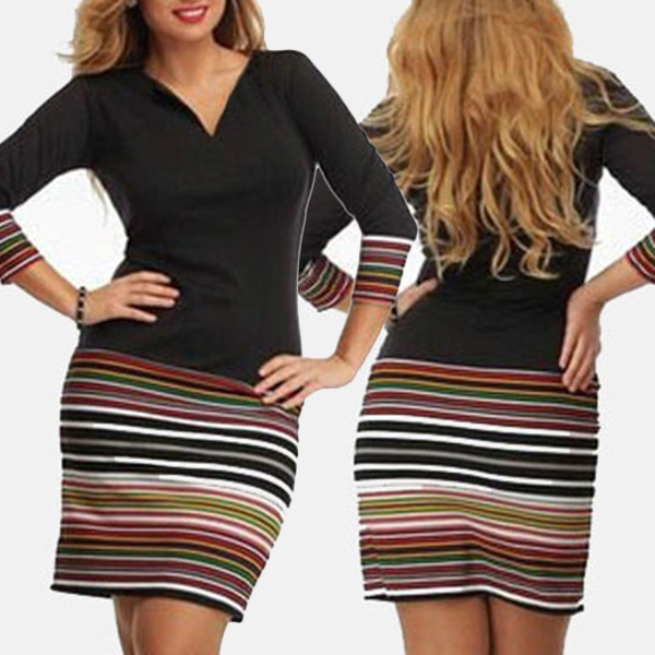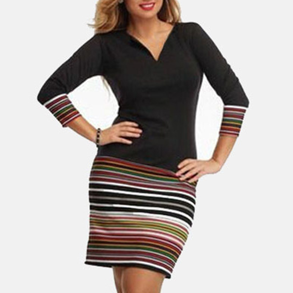 This dress is designed with the colorful striped spliced details,which will make it look more stylish and attractive. Finished with long sleeve,v-neck and a fit silhouette,this piece also can showcase your slender figure. So why not invite this wonderful piece for your spring and autumn days?