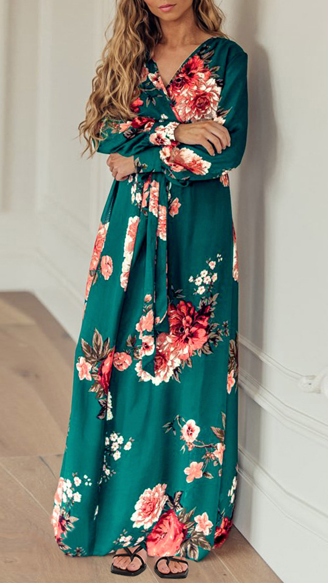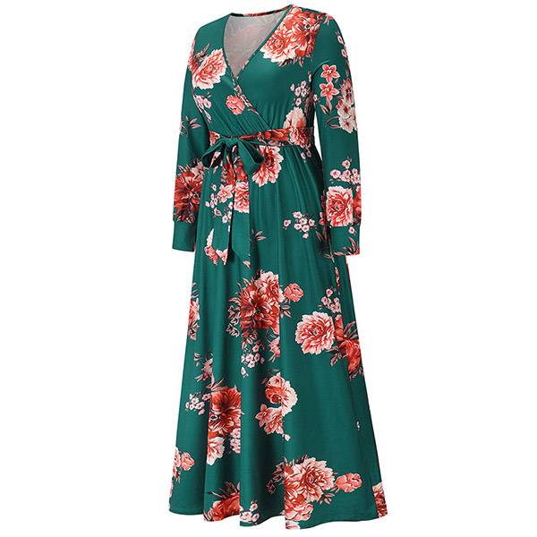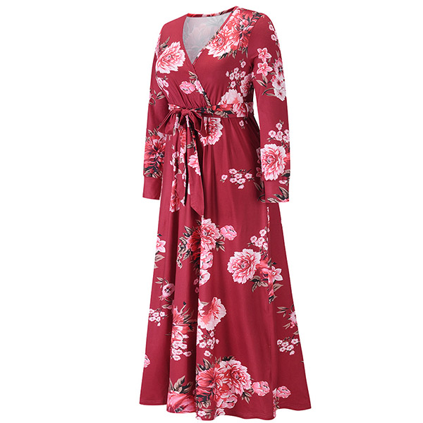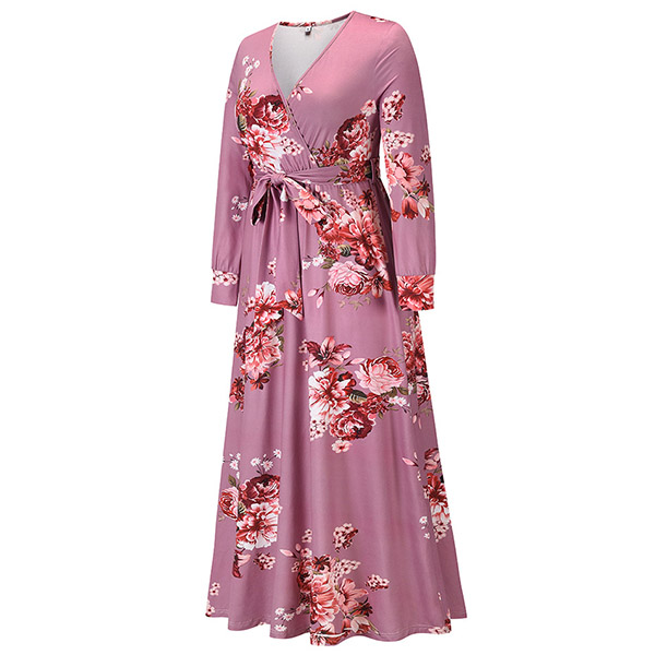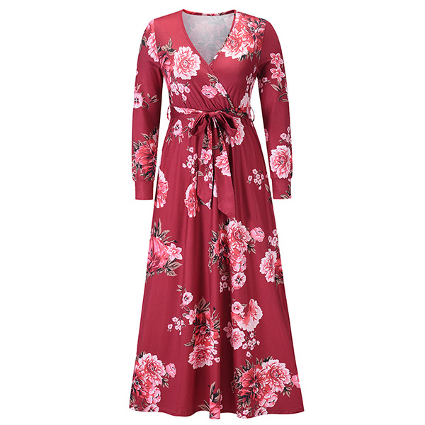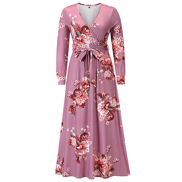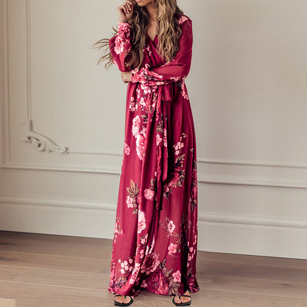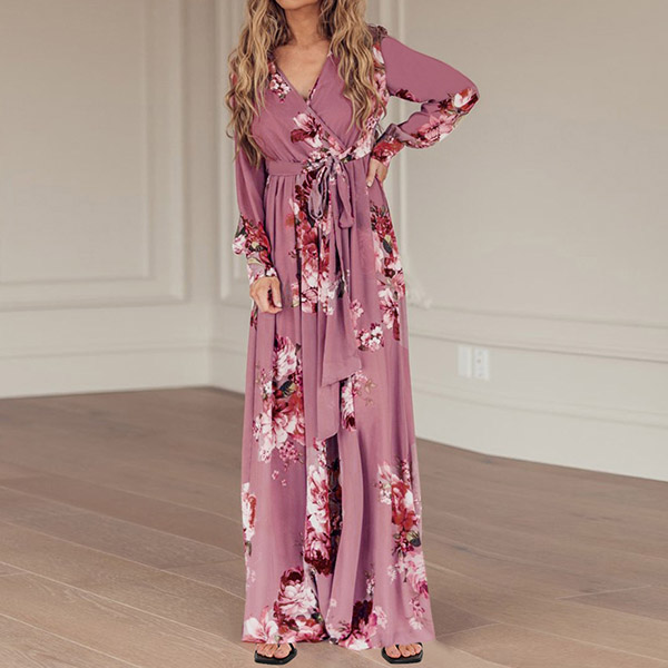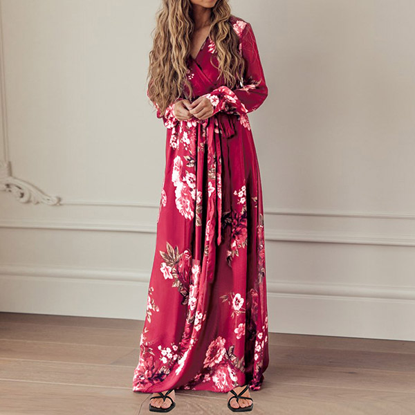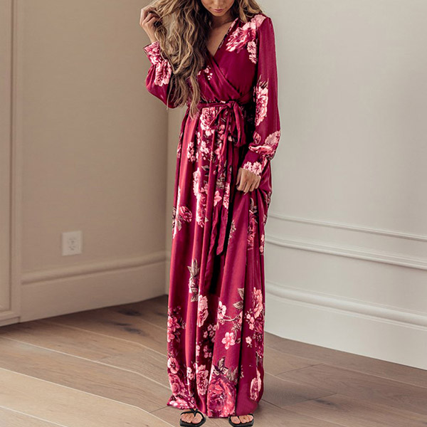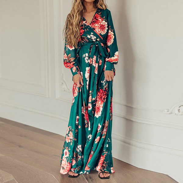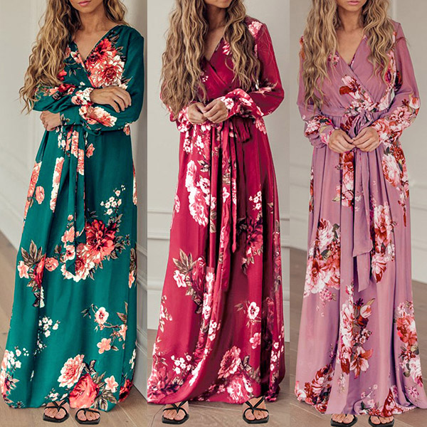 Your wardrobe would be more colorful by adding this printed dress. Its vibrant floral print details can help you catch more eyes. Finished with long sleeve,deep v-neck,high waist and a maxi length,this dress not only can showcase your slender figure,but also can enhance your feminine appeal.
