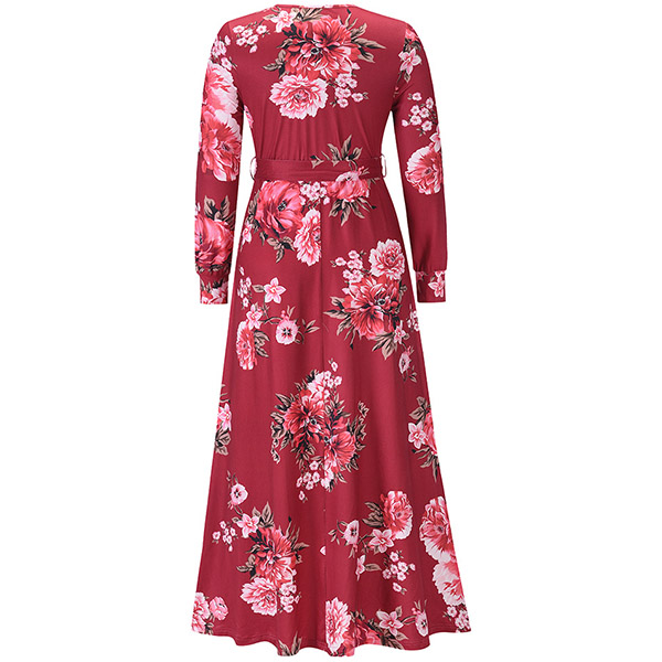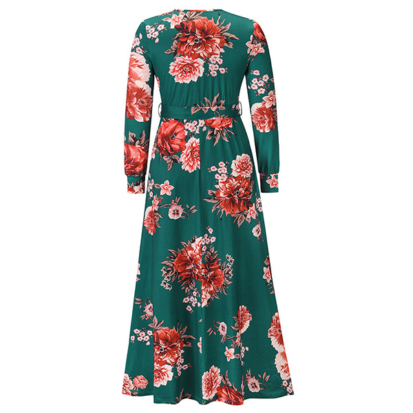Sexy V-neck Long Sleeve Tie-belt High Waist Printed Maxi Dress