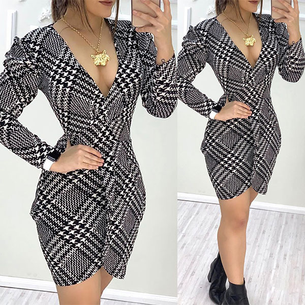 Sexy V-neck Long Sleeve V-neck Slim Fit Houndstooth Dress
