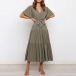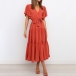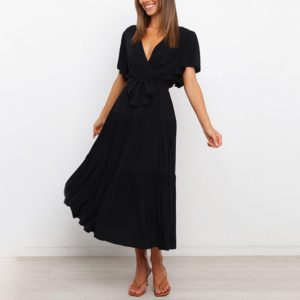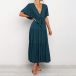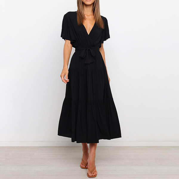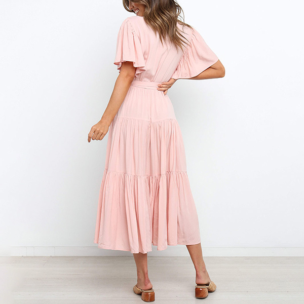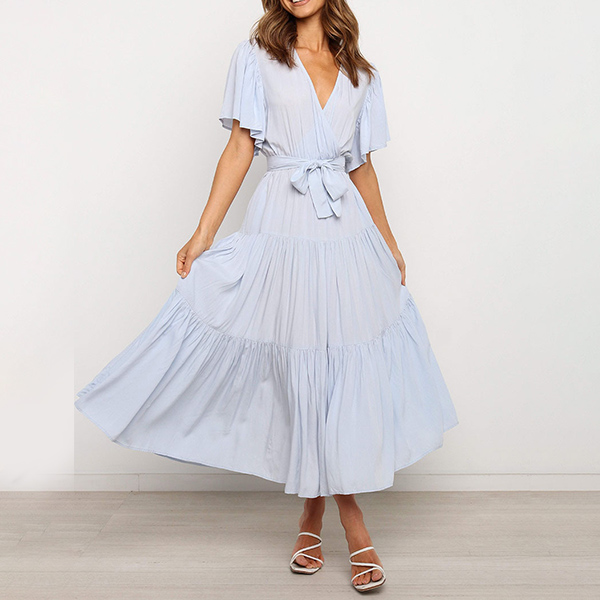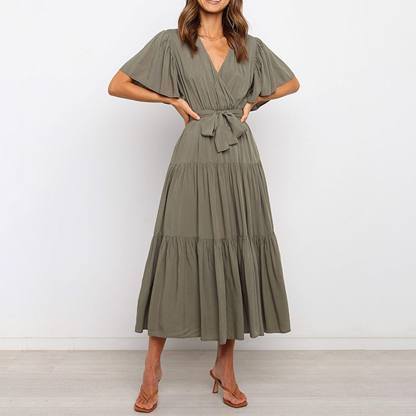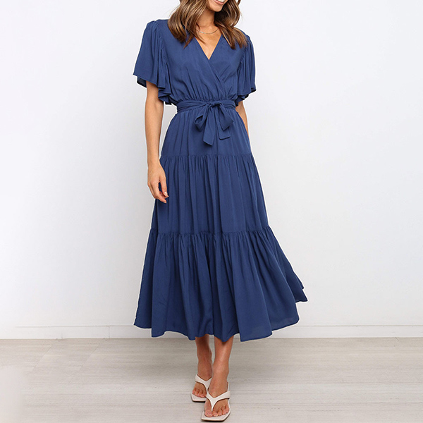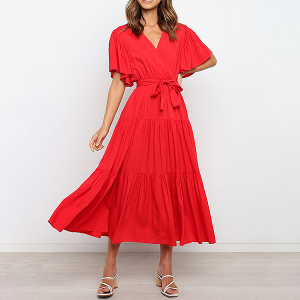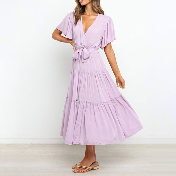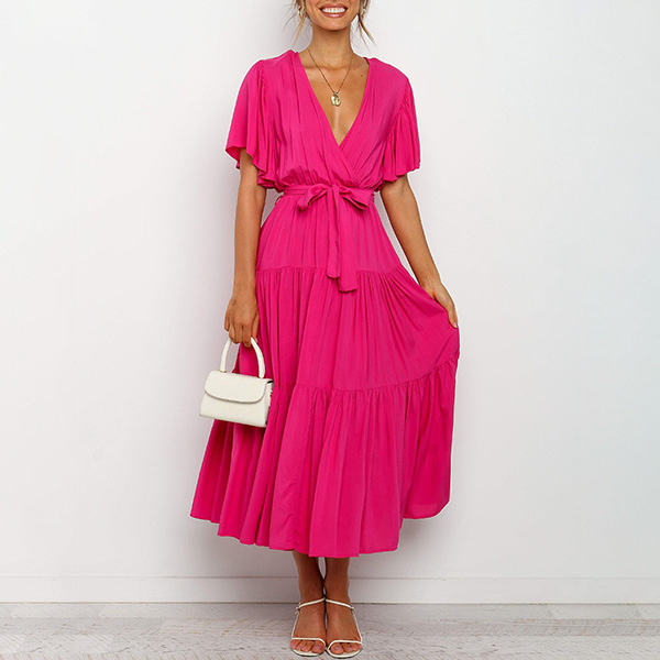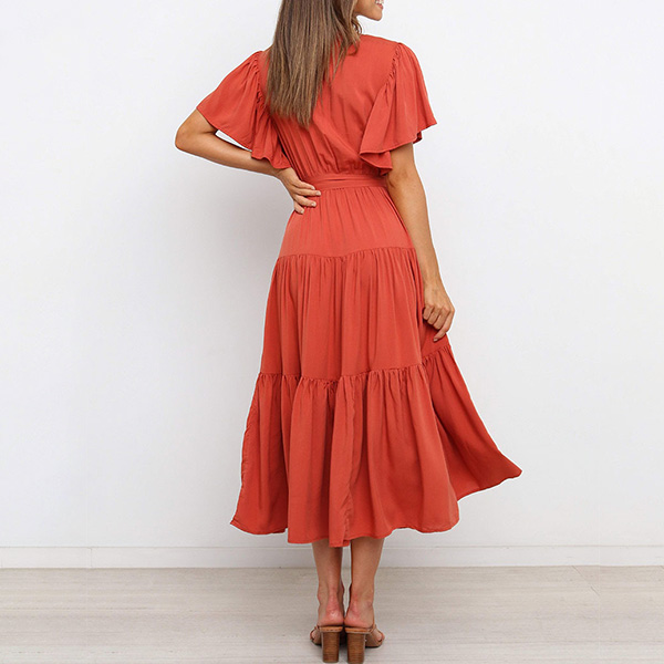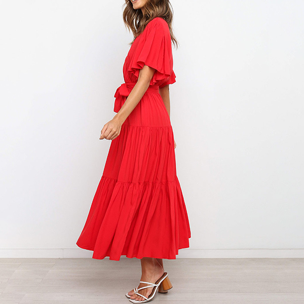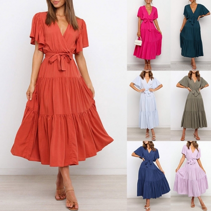 Sexy V-neck Lotus Sleeve High Waist Solid Color Dress