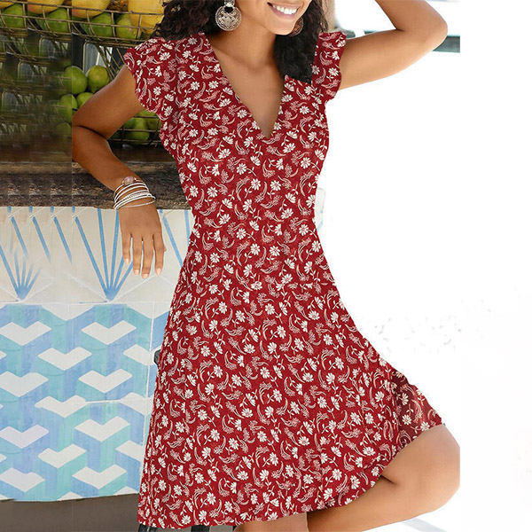 Sexy V-neck Lotus Sleeve Printed Dress