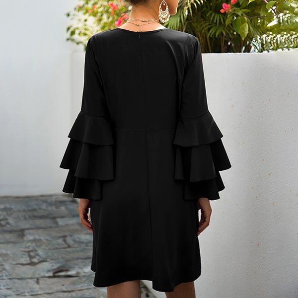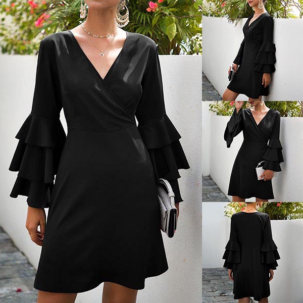 Let your style make the ultimate statement by wearing this stunning dress. It comes with a classic yet flattering black tone,the deep v-neck and lotus sleeve design can easily enhance your feminine appeal. When invited to some fancy events like cocktail parties or weekend gatherings,this beautiful dress can be a wise choice.