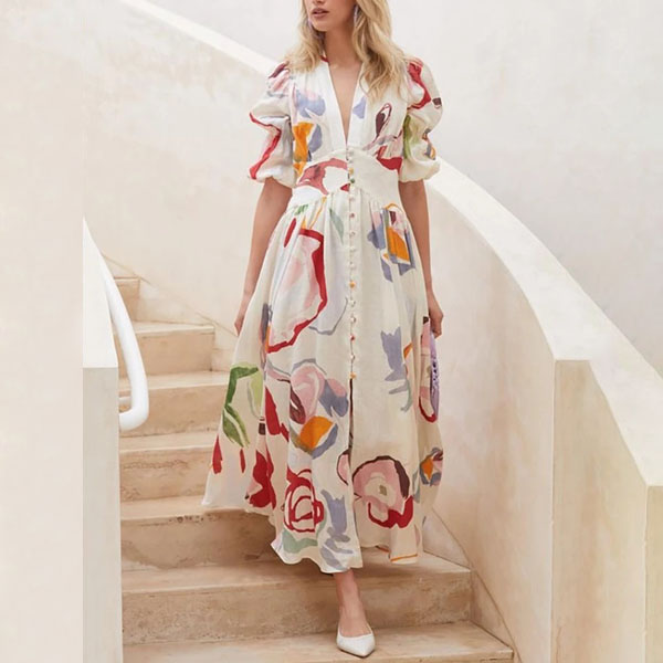 Sexy V-neck Puff Sleeve High Waist Printed Dress