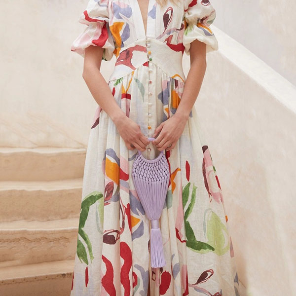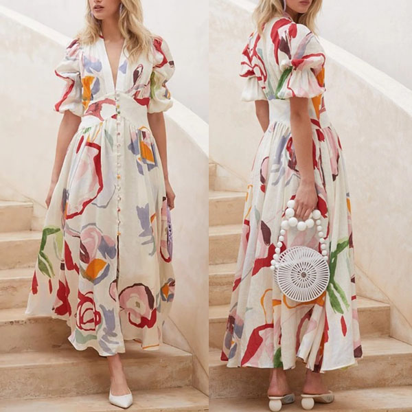 There is no doubt that you can easily win more eyes when you go out with this beautiful dress. Its colorful printed details make this piece look so eye-catching,while the deep v-neck and puff sleeve design will enhance your feminine appeal. You can dress it up with your sexy heels to achieve for a beautiful look.