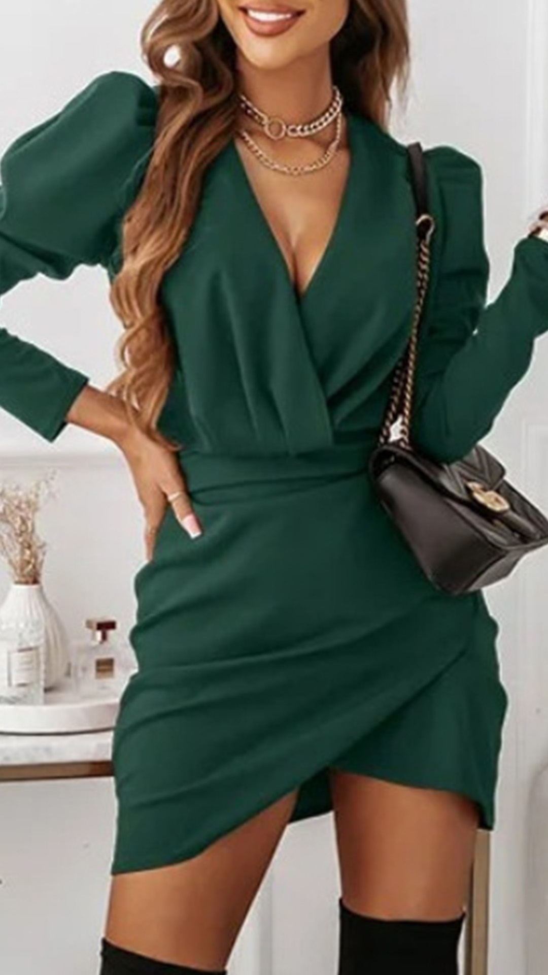 Sexy V-neck Puff Sleeve Irregular Hem Solid Color Slim Fit Party Dress