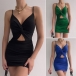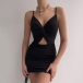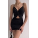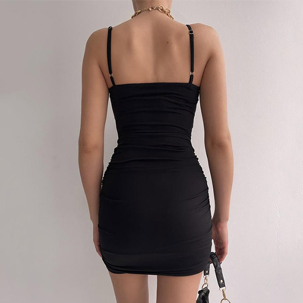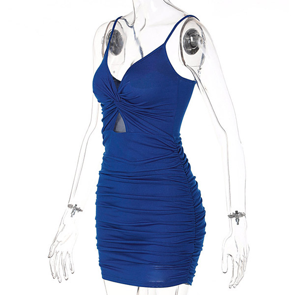 This is a sexy bodycon dress with a v-neck neckline, ruched sides, and front cutouts at the waist. It is made from a stretchy material that will hug your curves in all the right places.