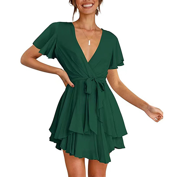 Sexy V-neck Ruffle Cuff Solid Color Lace-up Bow-knot High Waist Dress