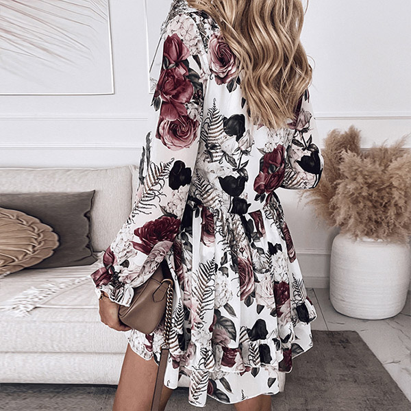 Sexy V-neck Ruffle Hem Long Sleeve High Waist Printed Dress