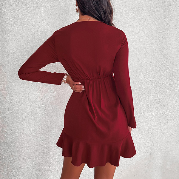 Sexy V-neck Ruffle Hem Long Sleeve Solid Color Slim Fit Dress