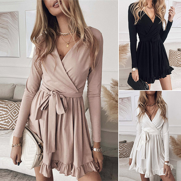 Wanna your dating look full of sweet and flirty sense? Then you can make your eyes focused on this dress. It comes with a solid color,the v-neck and ruffle hem design are the highlights,which can easily enhance the entire charm,while the tie-belt design will showcase your figure and waistline. You can dress it up with your sexy heels for a beautiful and charming look!