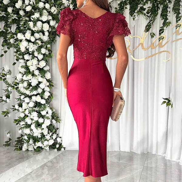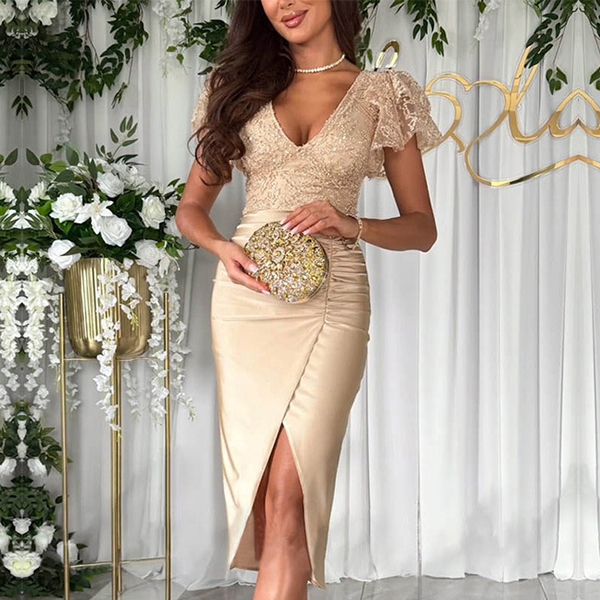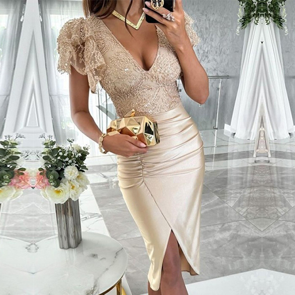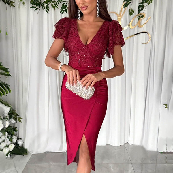 Sexy V-neck Ruffled Short Sleeve Slit Lace Spliced Bodycon Dress