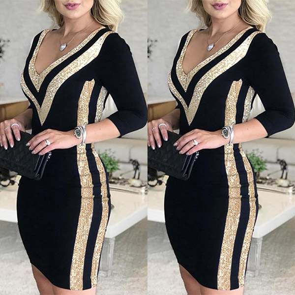 Wanna be the focus in the crowd? This piece can help you make it. Adopted the black as its main color, designed with V-neck and long sleeve, decorated with the golden sequins around the V-neck and along the two sides, it can make you look so distinctive and attractive among the people.