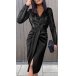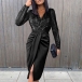 Sexy V-neck Sequin Spliced Long Sleeve Slit Hem High Waist Slim Fit Dress