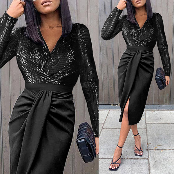 When you have this dress in your team,you have no need to worry about what to wear for your fancy events. The deep v-neck,slit hem and sequin spliced details make this piece look so shinning and alluring,while the high waist and fit silhouette design will showcase your slender figure. You can just match with your sexy heels and elegant clutch for an amazing look.