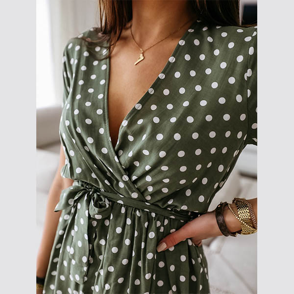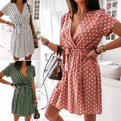No matter for your night dating or weekend out with your friends,you can trust in this dress to express your beauty and charm. The dots printed details make this piece look so eye-catching and playful. Finished with short sleeve and v-neck design,this dress knows how to enhance your feminine appeal.