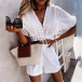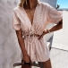 Sexy V-neck Short Sleeve Drawstring Hem Lace Top + High Waist Shorts Two-piece Set
