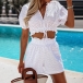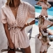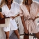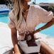 As for a sexy and charming summer look,you can just have a try this two-piece set. The deep v-neck and hollow out details make it look so sexy and alluring. Including a short sleeve crop top and a high waist shorts,this two-piece set can showcase your figure. And the drawstring hem design will add some chic and unique vibes. Let it accompany your summer days.
