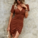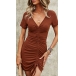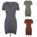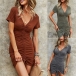 Sexy V-neck Short Sleeve Drawstring Slim Fit Solid Color Dress