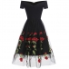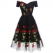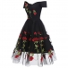 Sexy V-neck Short Sleeve High Waist Embroidery Rose Gauze Spliced Party Dress